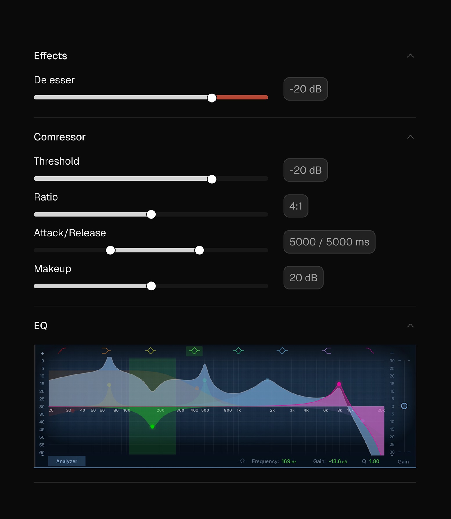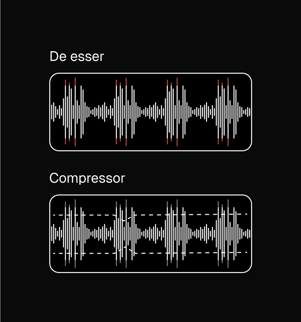 For example, when adjusting the de-esser, users can see where sibilance occurs in the waveform and understand how the effect is applied. The same applies to the compressor — changes to parameters like attack or release should be reflected directly in the curve so users can immediately see how the dynamics are affected.